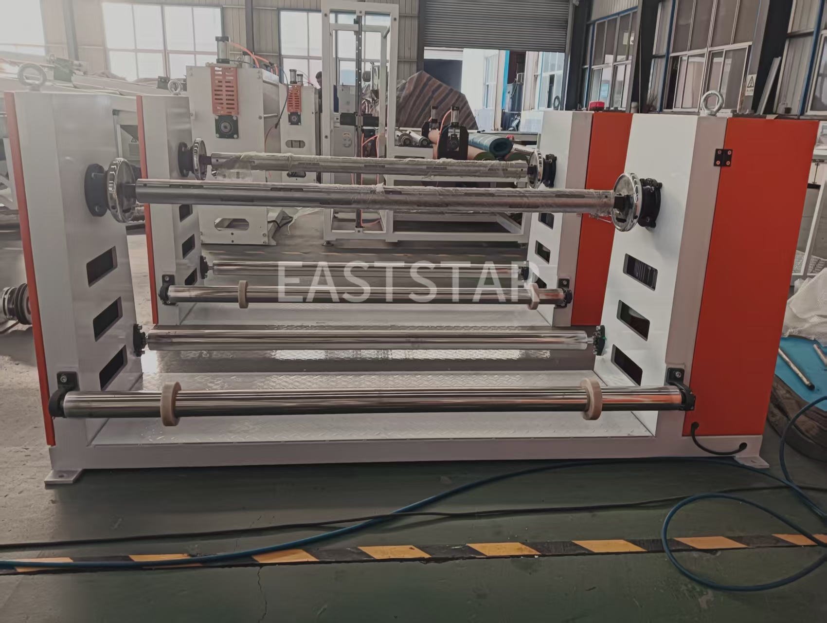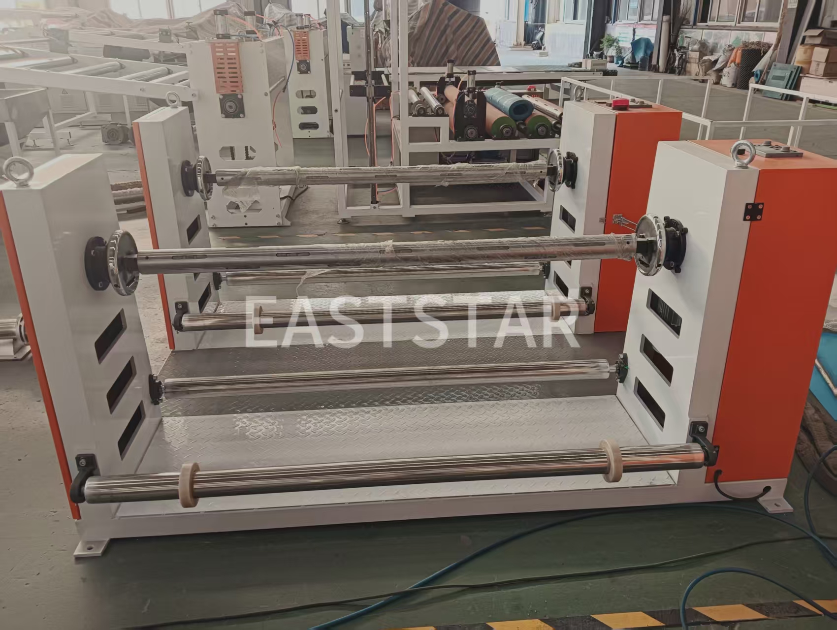 ரோலர் வெப்பநிலை கட்டுப்பாட்டு அமைப்பு ±1℃ வெப்பநிலை கட்டுப்பாட்டு துல்லியத்துடன், மென்மையாக்கப்பட்ட சுத்தமான தண்ணீரை ஊடகமாகப் பயன்படுத்துகிறது, மேலும் 2.2KW சுடு நீர் பம்ப் மற்றும் 9KW ஹீட்டர்களின் மூன்று செட்களுடன் பொருத்தப்பட்டுள்ளது. டூயல்-ஸ்டேஷன் அன்வைண்டிங் சாதனம் தொடர்ச்சியான உற்பத்தியை அடைய நியூமேடிக் ஷாஃப்ட் மற்றும் டென்ஷன் கண்ட்ரோல் சிஸ்டத்துடன் பொருத்தப்பட்டுள்ளது. திநீர்ப்புகா சவ்வு உற்பத்தி வரிநேர்த்தியான தயாரிப்பு விளிம்புகளை உறுதி செய்வதற்காக எட்ஜ் டிரிம்மிங் சாதனம் மற்றும் வேஸ்ட் எட்ஜ் வைண்டிங் சிஸ்டம் ஆகியவற்றைக் கொண்டுள்ளது.