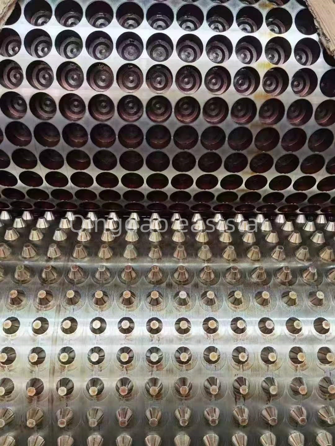 என்ற இறக்க அமைப்புPE வடிகால் வாரிய உற்பத்தி வரி0.8-1.2 மிமீ தடிமன் கொண்ட ஒற்றை அடுக்கு வடிகால் பலகைகளை உருவாக்கும் திறன் கொண்ட, 1650 மிமீ டை அகலத்துடன், கோட் ஹேங்கர் வகை ரன்னர் வடிவமைப்பை ஏற்றுக்கொள்கிறது. டை ரன்னர் மேற்பரப்பு குரோம் பூசப்பட்டு மிரர் ஃபினிஷிற்கு மெருகூட்டப்பட்டுள்ளது, குழி கரடுமுரடான Ra0.1um மற்றும் டை லிப் கரடுமுரடான Ra0.05um. டூ-ரோல் உருவாக்கும் சாதனத்தில் Φ450×1700மிமீ உருளைகள் பொருத்தப்பட்டுள்ளன, ரோலர் மேற்பரப்பு கடினத்தன்மை HRC58-62 மற்றும் குரோம் முலாம் பூசுதல் தடிமன் 0.08mm. ஒரு சிறப்பு மல்டி-ரன்னர் வடிவமைப்பு சீரான வெப்பநிலையை உறுதி செய்கிறது. இந்த தொழில்முறை கட்டமைப்புகள் வடிகால் பலகை தயாரிப்புகளால் உற்பத்தி செய்யப்படுவதற்கு உத்தரவாதம் அளிக்கின்றனஉற்பத்தி வரிஒரு சீரான புள்ளியிடப்பட்ட அமைப்பு மற்றும் நிலையான வடிகால் செயல்திறன்.