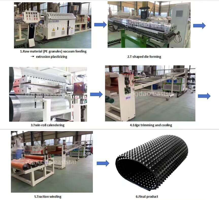 EASTSTAR இன் PE வடிகால் பலகை உற்பத்தி வரி என்பது உயர்தர, உயர் அடர்த்தி பாலிஎதிலின் (PE) வடிகால் பலகைகளின் பெரிய அளவிலான உற்பத்திக்காக வடிவமைக்கப்பட்ட ஒரு முழுமையான மற்றும் திறமையான தீர்வாகும். இந்த ஒருங்கிணைந்த உற்பத்தி வரிசையானது உணவு மற்றும் வெளியேற்றம் முதல் மோல்டிங் மற்றும் முறுக்கு வரை முழு செயல்முறையையும் தானியங்குபடுத்துகிறது. இந்த உற்பத்தி வரிசையின் மையத்தில் ஒரு உறுதியான 105/33 ஒற்றை-ஸ்க்ரூ எக்ஸ்ட்ரூடர் ஒரு துல்லியமான கோட் ஹேங்கர்-ஸ்டைல் டி-டை உடன் இணைக்கப்பட்டுள்ளது, இது சீரான வெளியீட்டிற்கு நிலையான மற்றும் சீரான உருகும் ஓட்டத்தை உறுதி செய்கிறது. மேலும், லைனில் மேம்பட்ட ட்வின்-ரோல் உருவாக்கும் அலகு மற்றும் ஒரு வெற்றிட அமைப்பு பொருத்தப்பட்டுள்ளது, இது 1500 மிமீ நிலையான அகலம் மற்றும் 0.8 மிமீ முதல் 1.2 மிமீ வரை அனுசரிப்பு தடிமன் கொண்ட வடிகால் பலகைகளின் துல்லியமான உற்பத்தியை செயல்படுத்துகிறது. அதன் நம்பகத்தன்மை, துல்லியம் மற்றும் அதிக அளவிலான ஆட்டோமேஷனுக்காகப் புகழ் பெற்ற இந்த உற்பத்தி வரியானது கட்டுமானம், சிவில் இன்ஜினியரிங் மற்றும் இயற்கையை ரசித்தல் ஆகியவற்றில் உள்ள பயன்பாடுகளுக்கு விருப்பமான தேர்வாகும்.